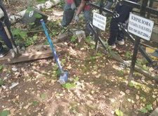 Для начала мы демонтировали уже имеющиеся элементы: снесли бетонный цоколь и изъяли стоящие кресты.
